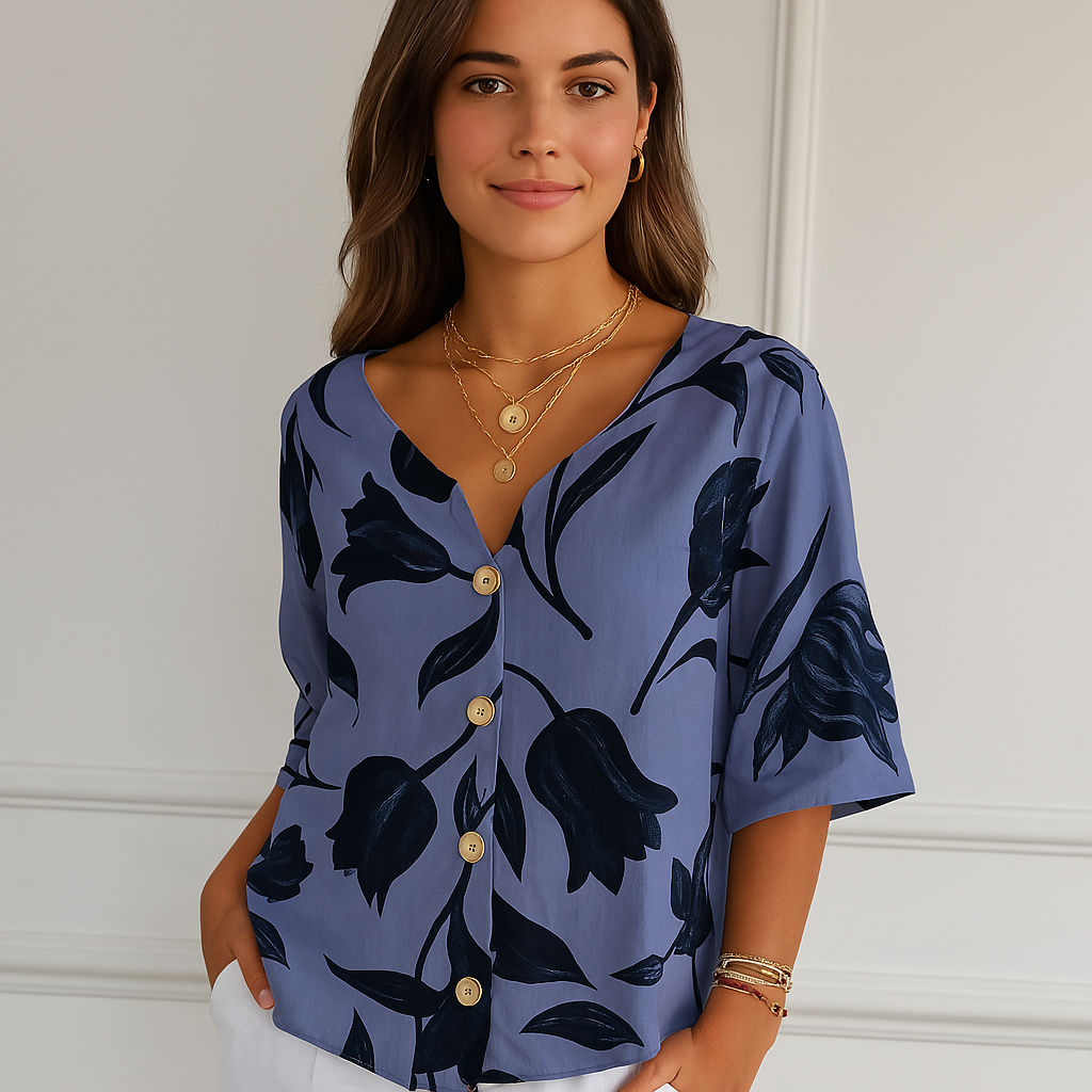 Dodajte svojmu šatníku nádych nadčasového šarmu s blúzkou Maxine – kvetinovou potlačou na gombíky, ktorá dokonale spája eleganciu s každodennou nositeľnosťou. Táto blúzka s jemnou, romantickou kvetinovou potlačou a klasickým dizajnom na gombíky vnesie do každého outfitu ležérnu ženstvenosť.